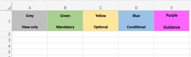 Column headers are colour-coded as follows: